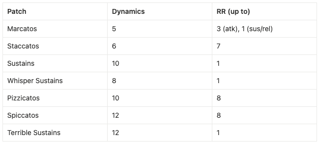 The first octave is covered only by the bass(es). The next octave features just the cellos, after which the violas and shortly after violins join in. As the range continues upward, the cellos eventually drop out, followed by the violas. At the very top, only the violins remain, with the highest note in the patches reaching G7 concert. Overall, the instruments stay mostly within their more comfortable ranges.